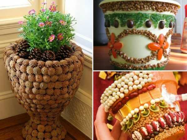 Палочкам, крышкам и пробкам, листам бумаги и продуктам питания. На фото декора цветочных горшков Вы можете увидеть разнообразные идеи, которыми вдохновитесь на создание неповторимых шедевров.