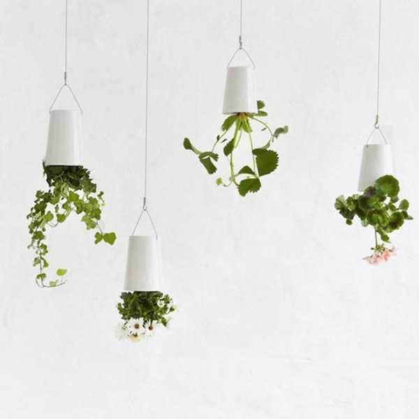 Смотрятся такие горшки с растениями потрясающе и необычно. Растения в них высаживают вверх ногами. Главное преимущество горшков-подвесок – они занимают минимум места, подходят даже самому маленькому помещению, используя бесполезное пространство на потолке.