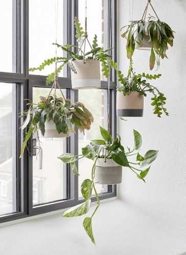 Подвесные кашпо представляют собой емкость, в которую устанавливается горшок с растением и вся конструкция подвешивается. Такой способ хорошо сохраняет растения от нападок домашних животных (особенно котов, которые так и норовят попробовать листики и цветочки на зуб).