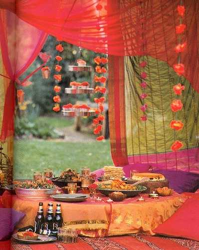 Для праздника постарайтесь подобрать кафе (или ресторан), оформленное в соответствующем стиле. Высокие расписные вазы, горшки для цветов из лозы, множество свечей станут отличным декором вашего мероприятия.