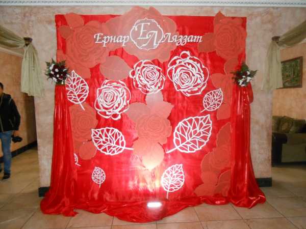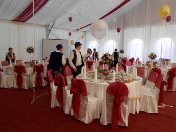 Оформление юбилея живыми цветами, драпировка тканью в бордовых цветах, бантики на стулья