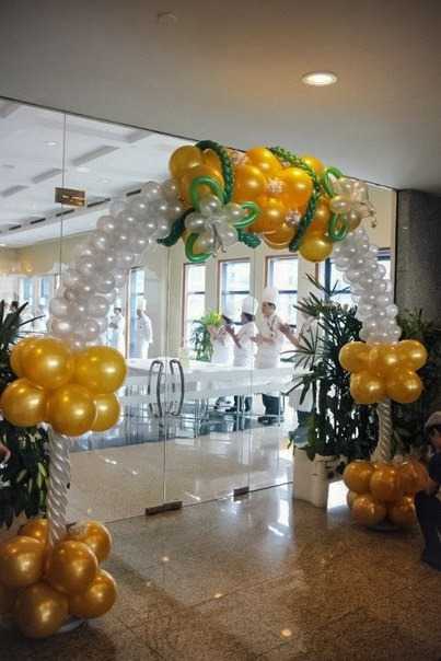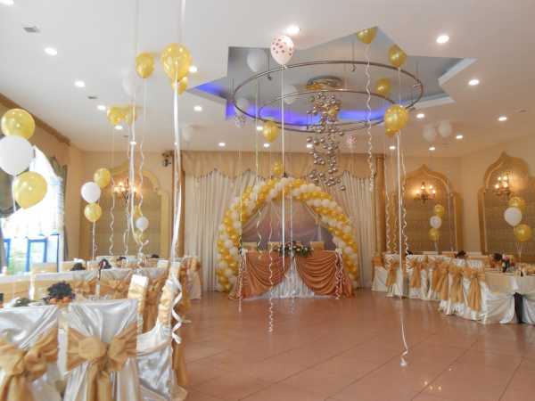 Декор, антураж, вся окружающая ваших гостей атмосфера должна быть пропитана ярким, насыщенным, солнечным цветом. Встречать гостей можно вот у такой арки. «Золотые» воздушные шары, как ни что иное, способны передать роскошь и помпезность предстоящего праздника! Игровой зал (зал для танцев и развлечений) стоит украсить серпантином с цифрой 50.