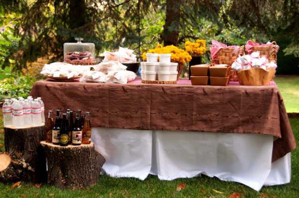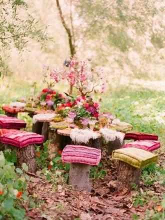 Вы также можете использовать природу для создания стола – пеньки, бревнышки и др. Прекрасным вариантом станет использование пледов, покрывал и одеял для удобного сидения.