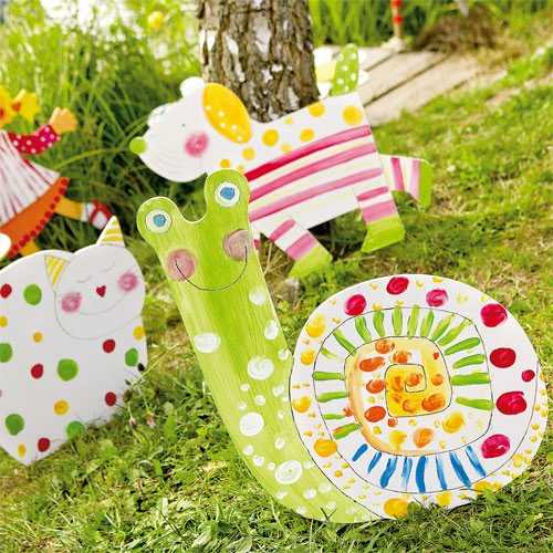 На зеленой траве, пеньках, дереве, лавочке, рядом с дорожкой могут разместить очаровательные цветные улитки на основе из картона. Для их производства можно использовать также не нужные картонные коробки от бытовой техники.