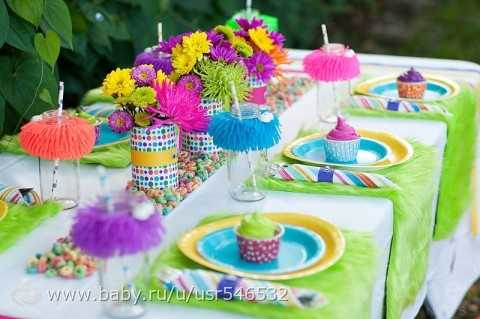 А вообще сам дачный участок/на природе уже сам по себе красив, зелен, и если добавить стол, стулья, яркие скатерти, детские развлекухи в виде бассейнов с шарами, горок пластиковых, детских стульчиков и столов, палаток детских, повесить гирлянды по верху, уже будет красиво и празднично!