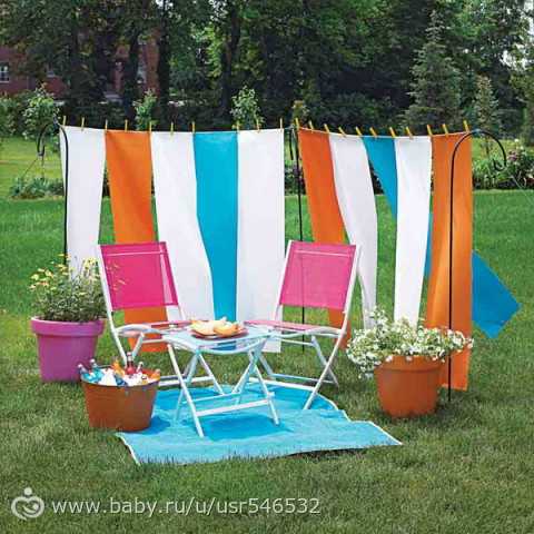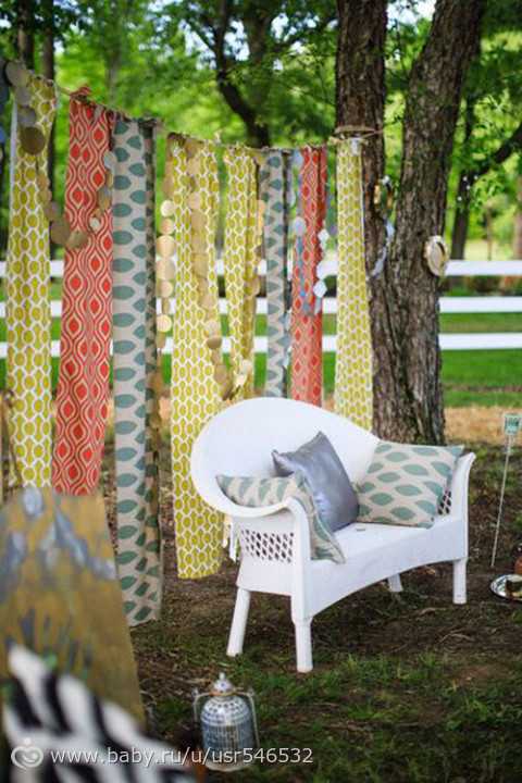 Между садовыми деревьями натянуть веревку, подвесить к ней ласкуты ткани ненужной из закромов либо те же гирлянды использовать (флажковые, кружочки, помпоны и тп) + какой-нибудь стул или скамеечка дачная+подушечки