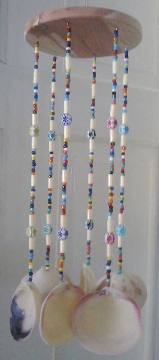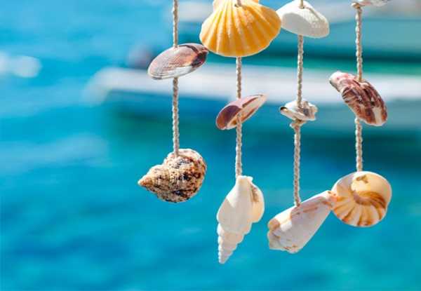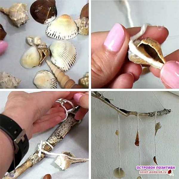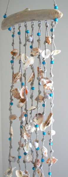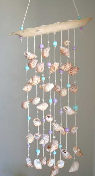 Очень популярно вешать в спальне ловца снов, но лучше поменять обыденную вещь на украшение из ракушек. Вам потребуется найти леску, палку для основы, клей. Просверлите маленькие дырочки дрелью. Сделайте 3-5 нитей, закрепив их на основании, нанизывая ракушки. Нужно повесить так, чтобы нечаянно не сломать конструкцию.