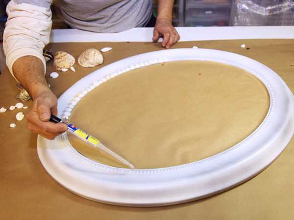 Приклеивая ракушки, необходимо позаботиться о прочности такого крепления. Клей должен подходить для влажных помещений, ведь на зеркало будут постоянно попадать вода и испарения.