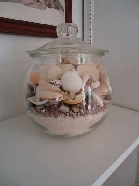Интересно будет смотреться даже простой стеклянный сосуд, наполненный дарами моря. Насыпьте в вазу, аквариум или широкий стакан немного песка, добавьте морских камушков и ракушек. Такой декор из ракушек используют для сервировки стола к празднику или просто располагают на полках, шкафах и тумбочках.