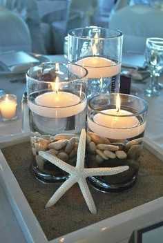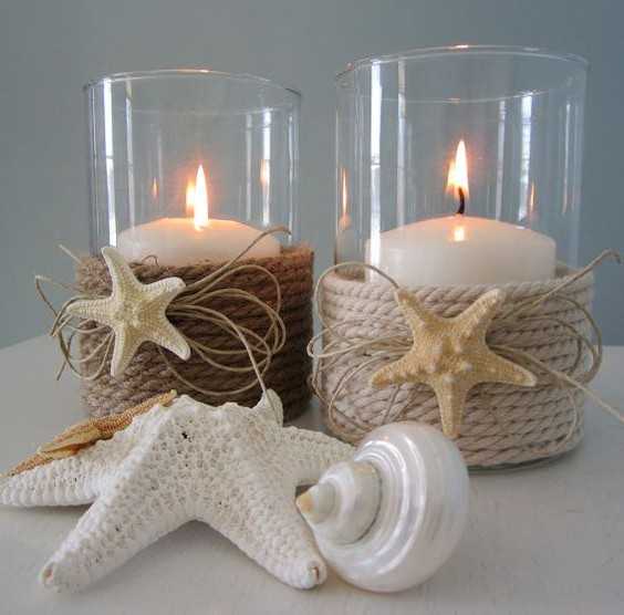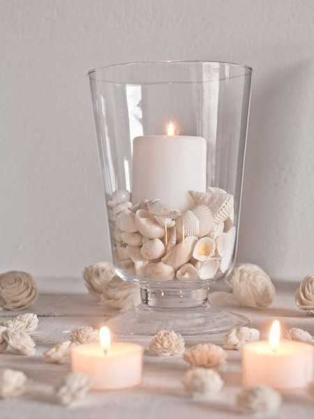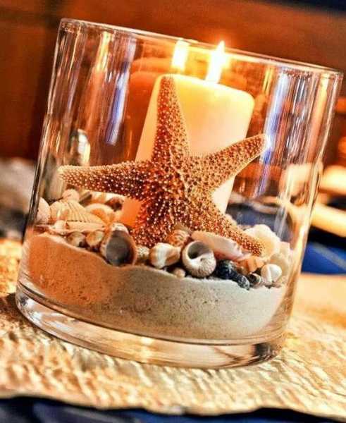 Романтичные натуры придумали практичное применение – подсвечники. Поищите дома ненужные стаканы, баночки, глубокие небольшие чашки. Наполните песком, камнями, а сверху положите ракушки. Свечку поставьте в центр, надежно установив, чтобы не упала. Выглядит очаровательно!