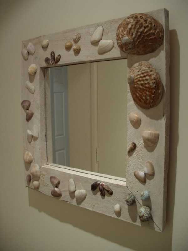 Идеально подойдет для украшения ракушками простое зеркало. Для этого также используют акриловые краски. Лучше выбирать тона, которые будут напоминать море и песок, которыми можно нарисовать волны, кусочек побережья. А дополнить такое изысканное зеркало способны ракушки. Их приклеивают с помощью клея. Главное выбирать такой клейкий материал, который смог выдержать пар, если декорирование будет происходить в ванной комнате.