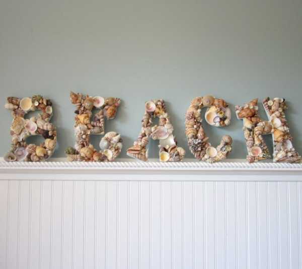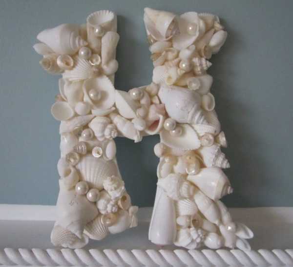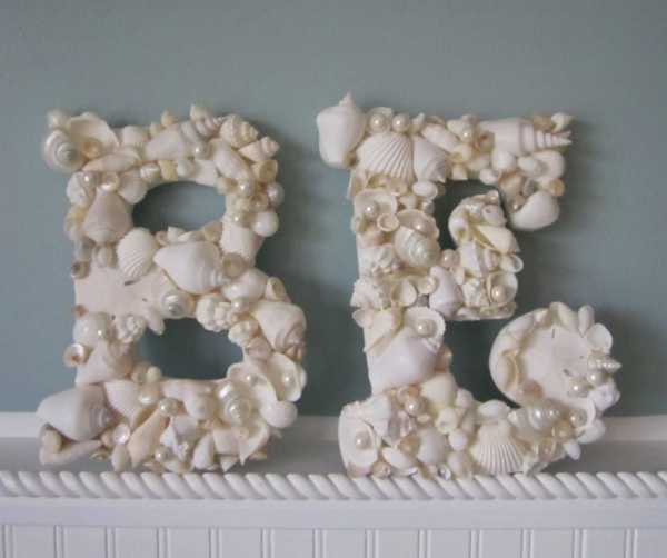 - Декоративные буквы – вырезаются трафареты, которые могут складываться в слово или обозначать первые буквы имен хозяев. Готовые буквы украшаются морскими ракушками по такому же принципу, как и обычные фоторамки.