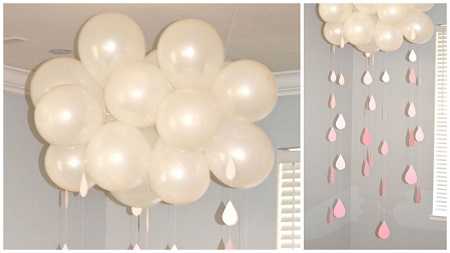 Еще один вариант декорации для беби-шауэра, ведь в переводе “шауэр” обозначает “душ” или “дождь”, а значит тучка с каплями будет на нем как нельзя кстати.