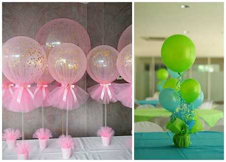 Очень нарядно смотрятся шары, обтянутые фатином или шифоном, так же симпатично будут выглядеть композиции из шариков, дополненные небольшими декоративными элементами, вроде бантиков, цветочков, бабочек.