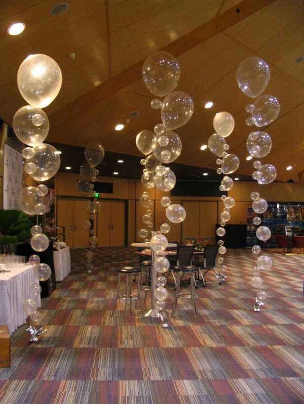 Оформляя потолочное пространство шарами, можно использовать шары с хвостиками – линколуны. Их очень удобно связывать между собою, поэтому необходимость дополнительных нитей, лесок, отпадет сама собою.