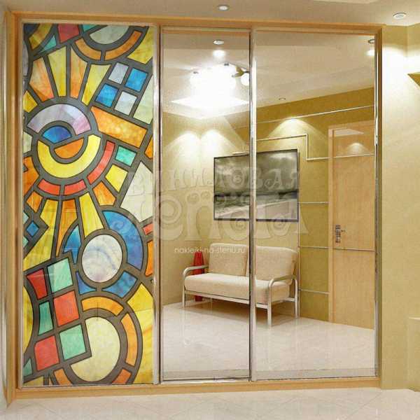 Технология предельно проста. Полупрозрачная витражная пленка с клеевой поверхностью наносится на зеркальную дверь шкафа-купе. Пленка пропускает свет, который возвращается к нам через отражение. В результате возникает эффект свечения, сходный с отражением от цветного стекла. Нанести витражи на зеркало шкафа-купе также просто, как обычную виниловую наклейку. Оцените декоративный эффект.