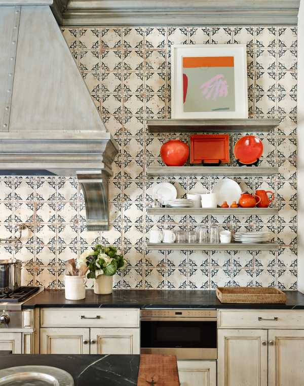 Из цинка же изготовлены консоли, поддерживающие довольно тяжёлый капюшон, и небольшие открытые полки. Их лаконичность уравновешивается набивным орнаментом плитки и сочным оранжевым цветом посуды.