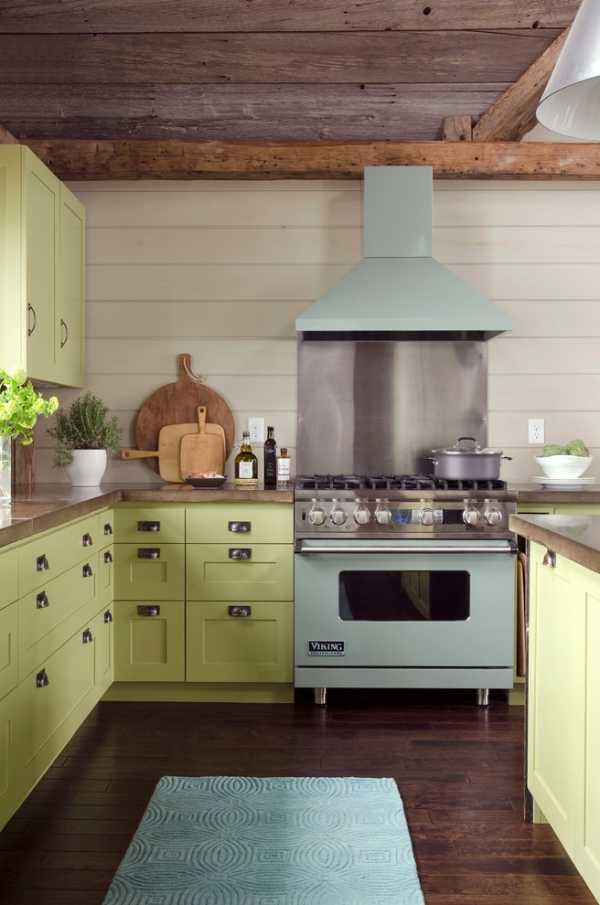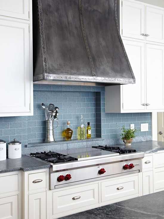Вы не являетесь сторонником смешивания материалов в одной композиции? Тогда, возможно, вам понравится идея окрашивания колпака в тот же цвет, что и плита. Во всяком случае, комбинация двух предметов приглушённого голубого оттенка, представленная на этом фото, кажется очень интересной.