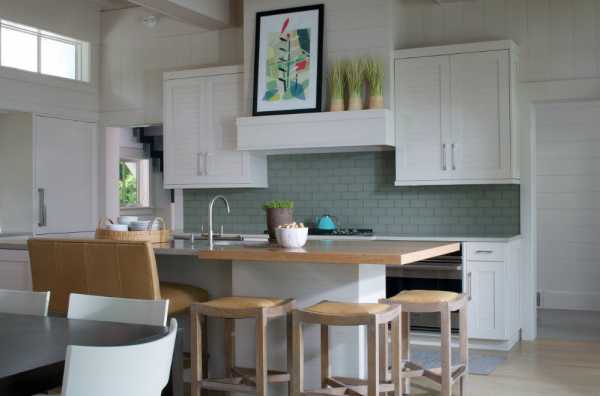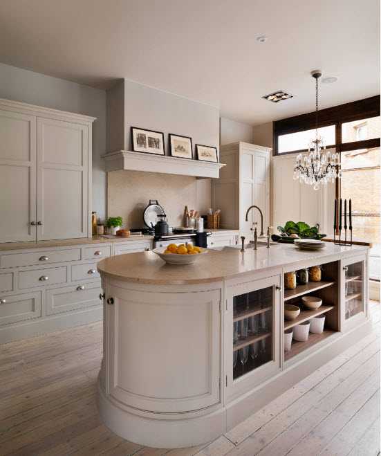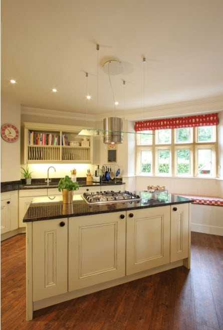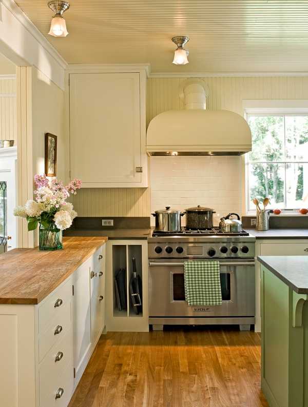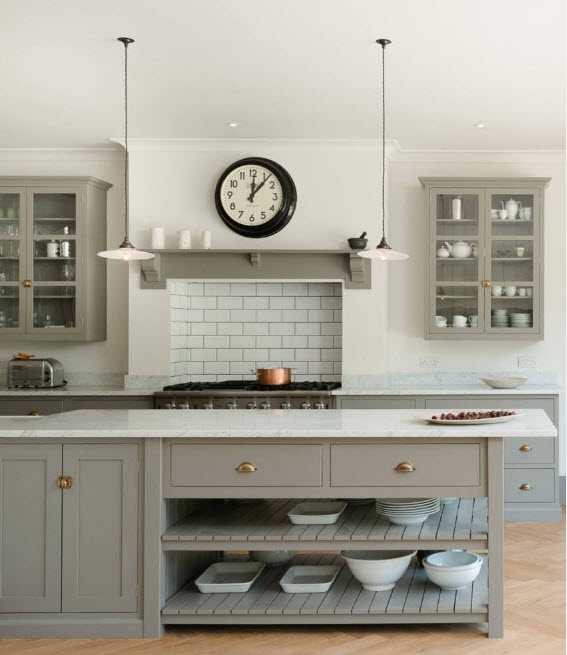 Узкая полка, закреплённая на фасаде капюшона, позволяет владельцам этой кухни демонстрировать наиболее интересные предметы из имеющейся у них коллекции антикварной посуды.