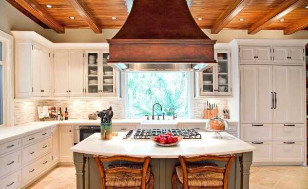Существует принципиально иной подход к установке «островной» вытяжки. Её можно сделать центральным элементом интерьера, а этого, безусловно, проще всего добиться при помощи колпака из меди. Что касается следующего фото: вытяжка, представленная на нём, доминирует на общем фоне, но выглядит вполне уместно, идеально сочетаясь с деревянной обшивкой потолка.