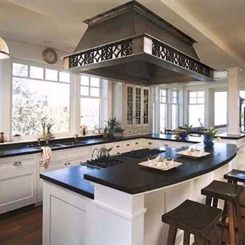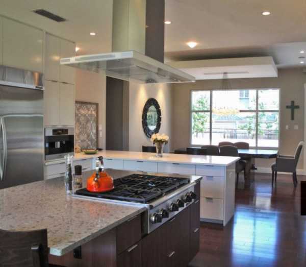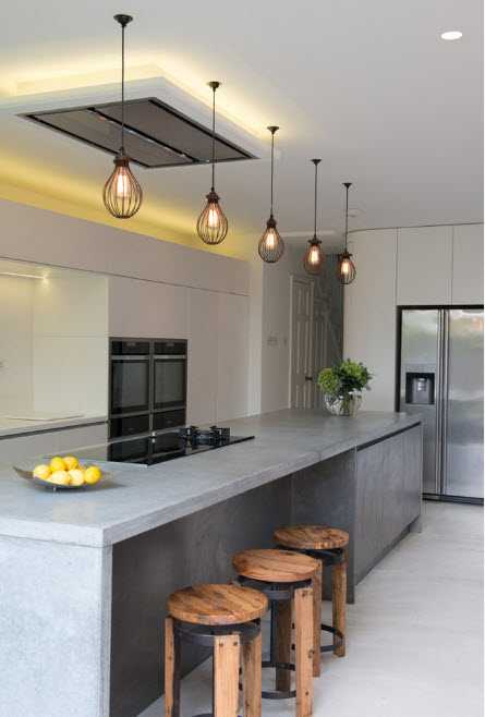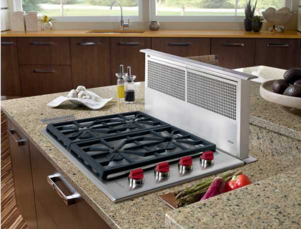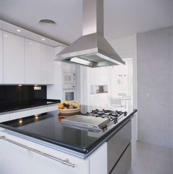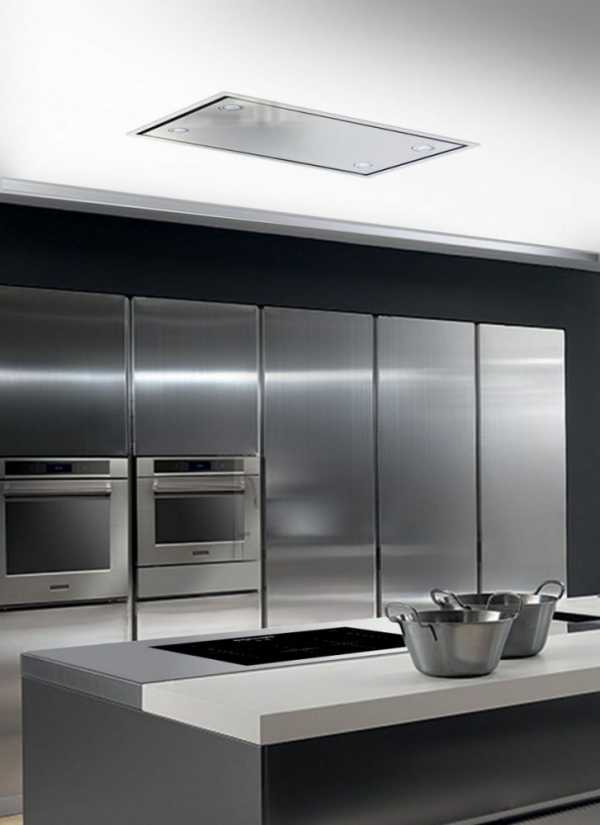 Когда речь идёт о варочных поверхностях, вмонтированных в столешницу острова, единственным возможным вариантом остаётся вытяжка с потолочным креплением. Правда, уже существуют компактные настольные модели, но они пока не слишком распространены.