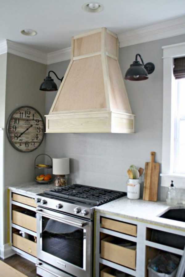 Колпак на фото изготовлен на заказ из древесины, а нижний его край украшен очаровательной резьбой. Цвет для него был выбран тот же самый, что у шкафов, благодаря чему композиция кажется очень цельной и идеально сбалансированной.