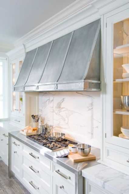 Металлические короба для вытяжки также могут стать настоящим украшением для кухни. Например, цинковый большой короб отлично вписывается в эту кухню в средиземноморском стиле, прекрасно сочетаясь с выбранной цветовой гаммой помещения.