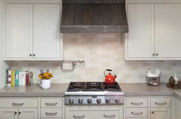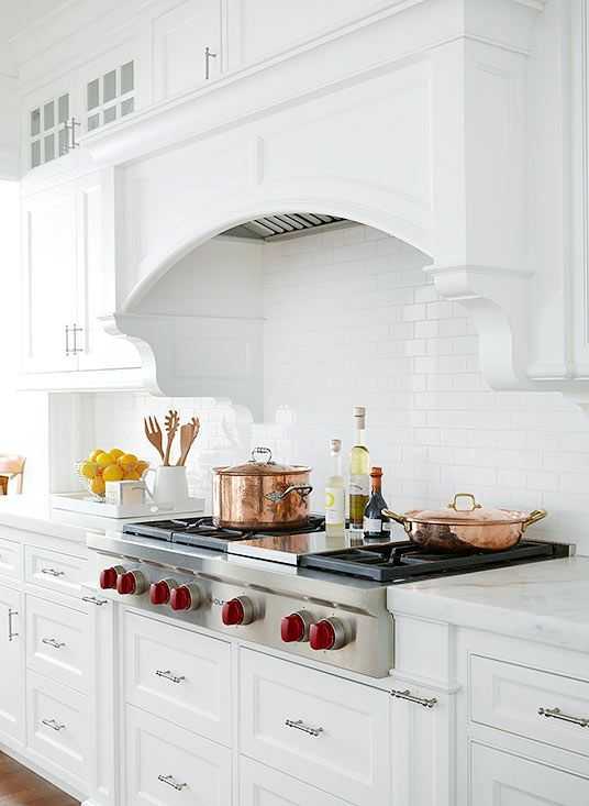 Двухцветный колпак — это ещё одно решение, которое заслуживает вашего внимания. В то время как центральная часть колпака на фото кажется металлической (хотя она изготовлена из древесины клёна и просто покрашена соответствующим образом), декоративные детали белого цвета вторят декору кухонного гарнитура.