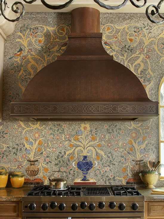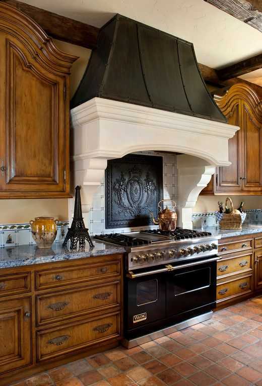 Колпаки, облицованные мелкой плиткой, можно увидеть нечасто. Но именно такой представлен на фото. Дизайнеры дополнили его резным бордюром, подчеркнув женственность этого кухонного интерьера.