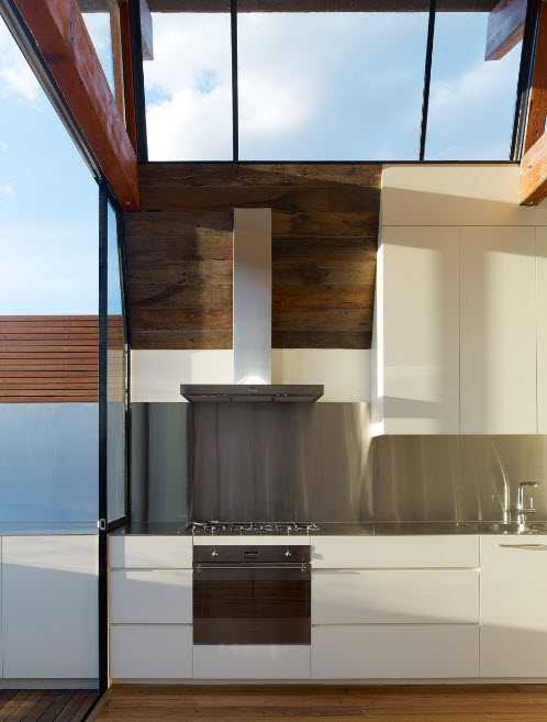 В этом случае весь капюшон полностью изготовлен из восстановленной древесины. Дизайнеры использовали доски, оставшиеся после частичной разборки амбара, расположенного на заднем дворе дома заказчиков. Это стоило сделать хотя бы ради восхитительной текстуры, которой обладает выветренная древесина.