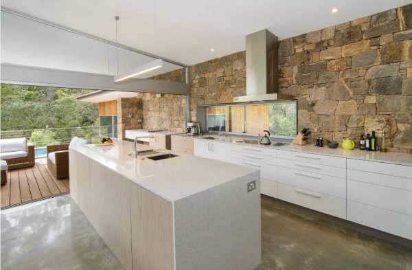 В кухнях с высокими потолками довольно часто устанавливают вытяжки с наружным дымоходом. Благодаря своей впечатляющей длине такой элемент неизбежно оказывается в центре внимания.
