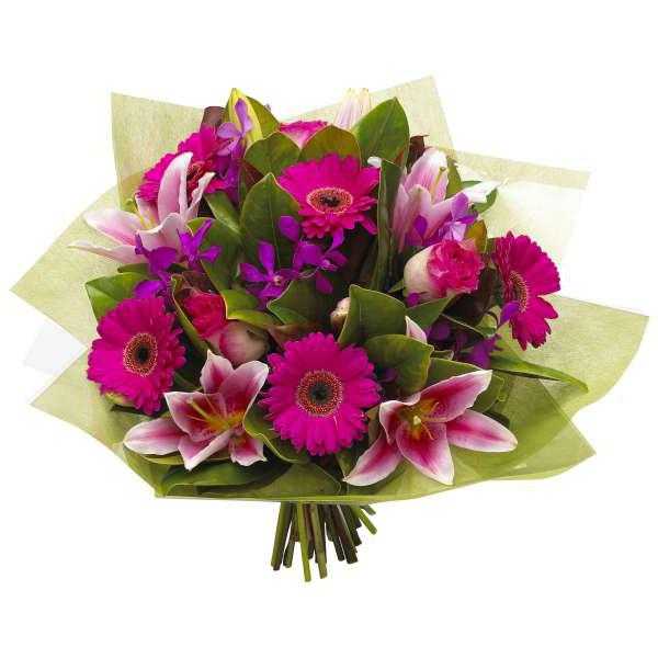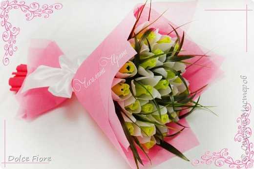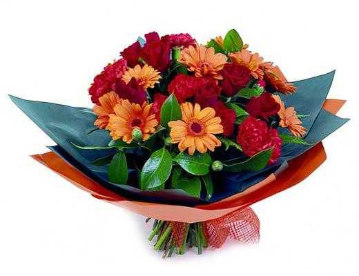Поместите на нее цветы так, чтобы концы стеблей остались свободными. Далее заверните букет в бумагу и перевяжите лентой. В качестве декораций используйте декоративные бабочки или бантики.