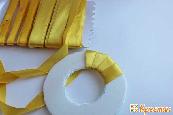 Берем атласную ленту. Подворачиваем или подрезаем «лепестки», чтобы они не выглядывали из-за ленты.