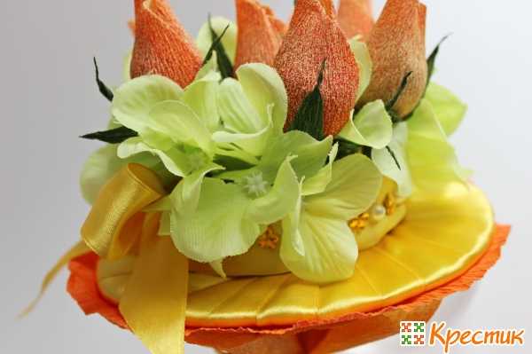Небольшой букетик цветов в виде знака внимания очень приятен. Сделайте такой букет из конфет и подарите просто так, без повода, подруге или маме, сестре или коллеге. И поверьте, они будут просто счастливы! Солнечные цвета в работе только приветствуются, поэтому бутоны роз у нас будут позитивного цвета оранж.