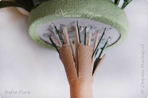 Вставляем наши цветы в пеноплексовый круг, собираем все стебли вместе и фиксируем горячим клеем (делаем осторожно и постепенно, т.к. горячий клей плавит пеноплекс). Вставлять стараемся по направлению к центру (подробно можно посмотреть в МК Марины, ссылка выше)