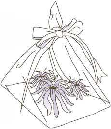Как упаковать цветок или букет из нежных соцветий? Классический вариант – использование широкой атласной ленты, опоясывающей стебли в 2-3 обхвата или полностью драпирующей нижнюю часть композиции. Из тканей применяются тонкая органза, флизелин, иногда – кружево в сочетании с плотной бумагой контрастного цвета.