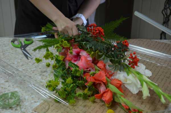 Теперь разложим наши растения – сначала гладиолусы сложите друг на друга так, чтобы их стебли скрестились под небольшим углом, затем расположите зелень, краспедию и рябину, обрамляя ими цветы. Заверните все растения в пленку, поочередно с правого и левого края.