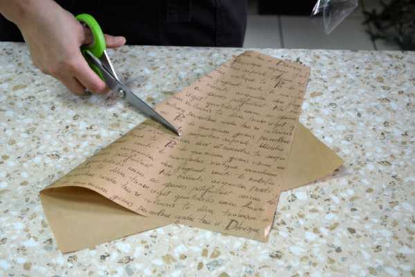 Из крафта вырежьте 3 квадрата примерно одного размера, и каждый разрежьте по диагонали до середины.