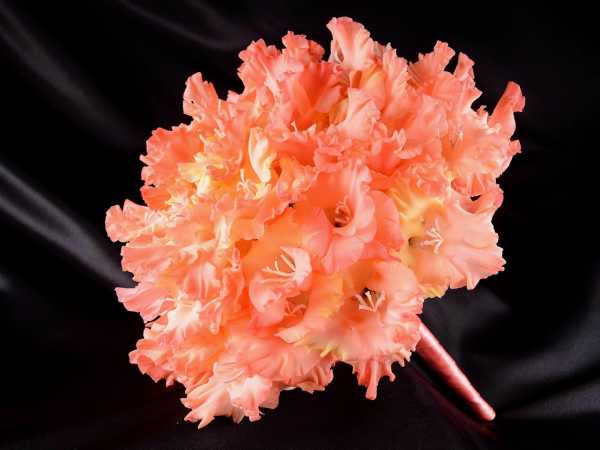 Сделать круглый свадебный букет из гладиолусов можно, не прибегая к раскладыванию каждого бутона на составляющие. Эти композиции тоже выглядят очень торжественно и необычно.