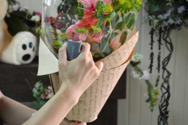 Флористический презент в подарочной бумаге сразу придется развернуть, чтоб не намочить упаковку. Зато первое впечатление ос