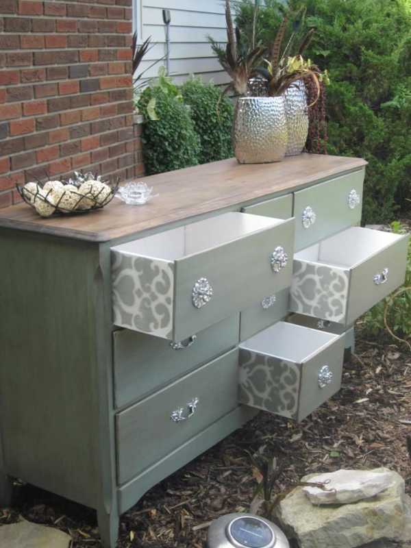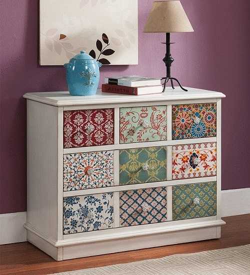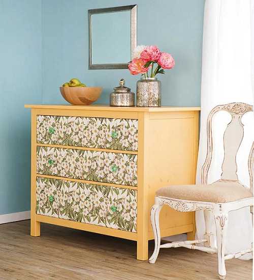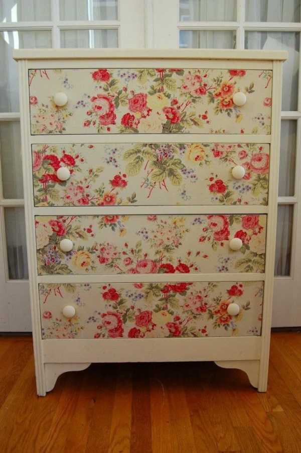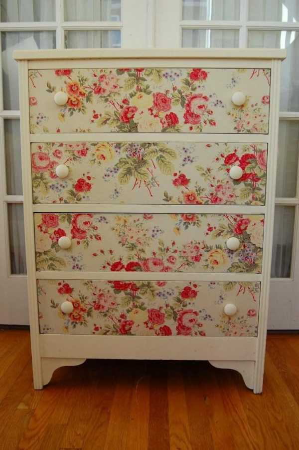 4. Внешний декор мебелиНаскучила старая мебель? Шкаф и комод приобрели потёртый вид? Исправить это легко при помощи обоев. Если вы не планируете в дальнейшем покрывать изделие лаком, то подойдут и бумажные, и виниловые обои. В противном случае от виниловых обоев придётся отказаться, так как они могут раствориться под действием лака. И ещё стоит помнить, что при лакировании цвет обоев изменится и станет темнее.