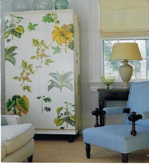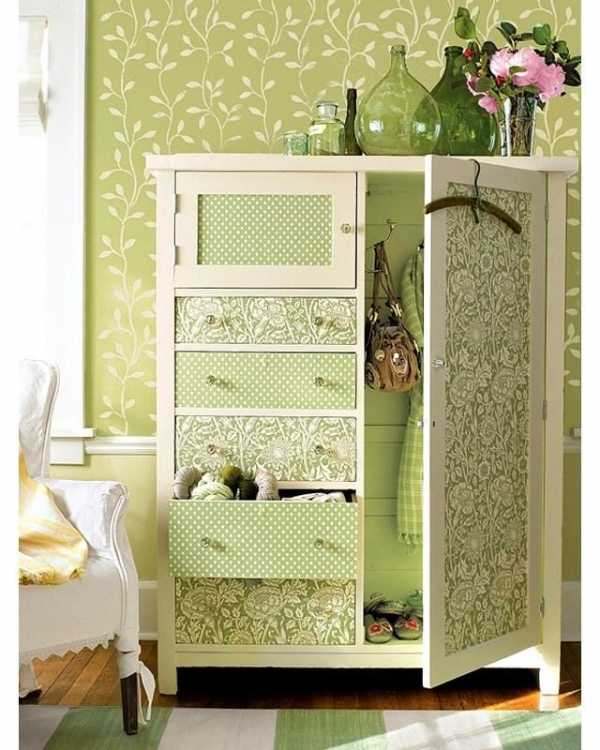 Наверняка эта идея приглянется рукодельницам, которые не прочь повозиться с остатками обоев, клеем и лаком для мебели. Оклеивать фасады мебели интересно, но это работа, требующая повышенной внимательности и аккуратности.