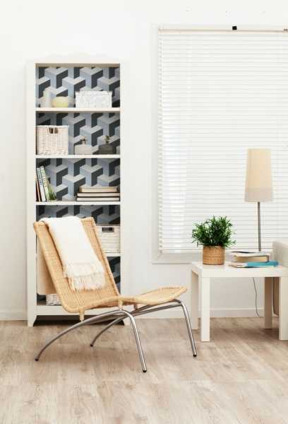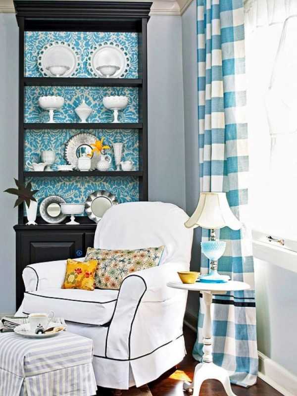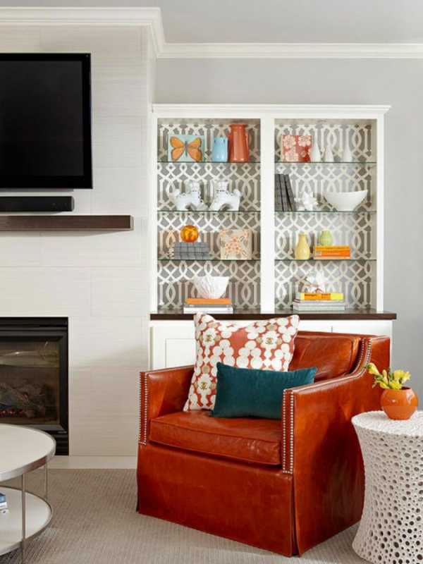 Не менее интересно смотрятся стеллажи, открытые тумбы и буфеты, оклеенные внутри обоями. Этот приём оживляет пространство, делает его более домашним и уютным. Особенно выигрышно будет смотреться такая мебель, если цвет обоев станет перекликаться с оттенком декоративных подушек или штор. Но стоит учитывать, что декорирование подобного плана требует аккуратности.