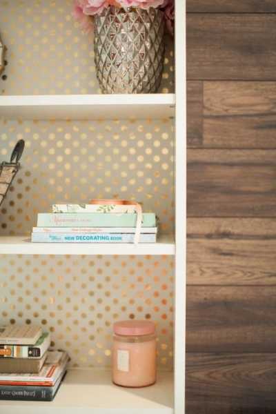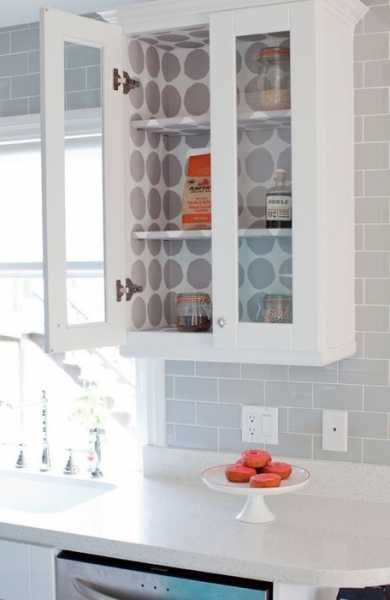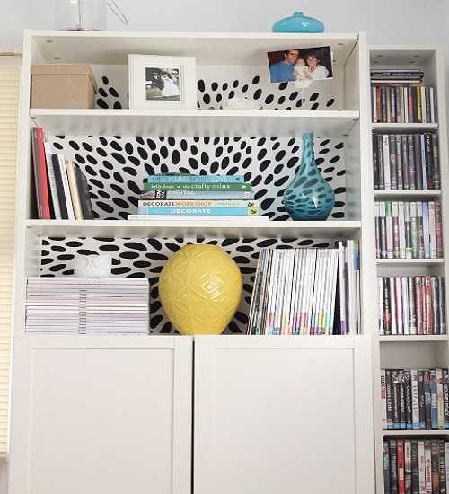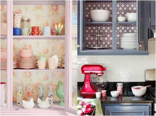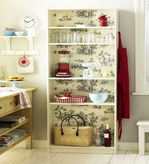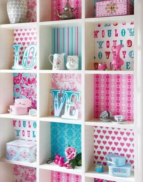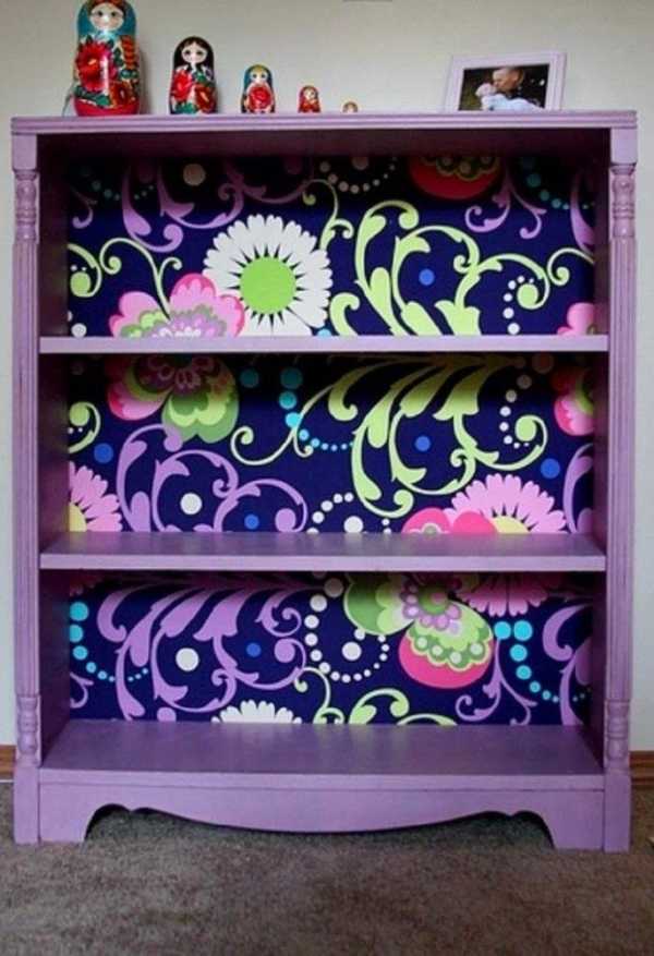 Очень распространенный прием — декорировать обоями мебель. Внутреннии и наружные стенки, фасады и дно полочек будут смотреться наряднее и ярче. Главное тут не перестараться, чтобы не получилось нечто аляповатое. Желательно, чтобы цвет обоев сочетался с основной концепцией дизайна, тогда эти детали будут смотреться гармонично и актуально.