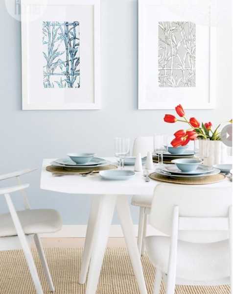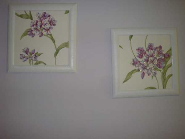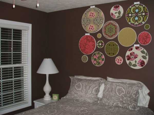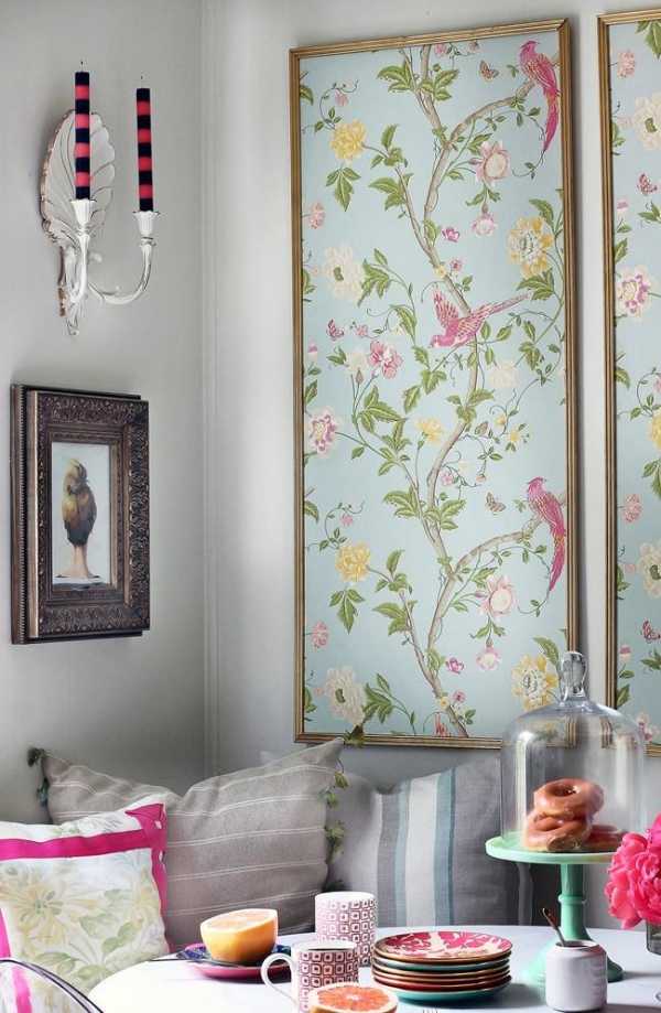 В качестве рамок можно использовать пяльцы. Такой необычный подход внесет изюминку в интерьер, а круглые формы придадут мягкости. Однотонную поверхность стены можно задекорировать целыми картинами из обоев. Куски обоев наклеиваются на картон и вставляются в раму. Или можно наоборот вырезать рамки из картона и оклеить их обоями.