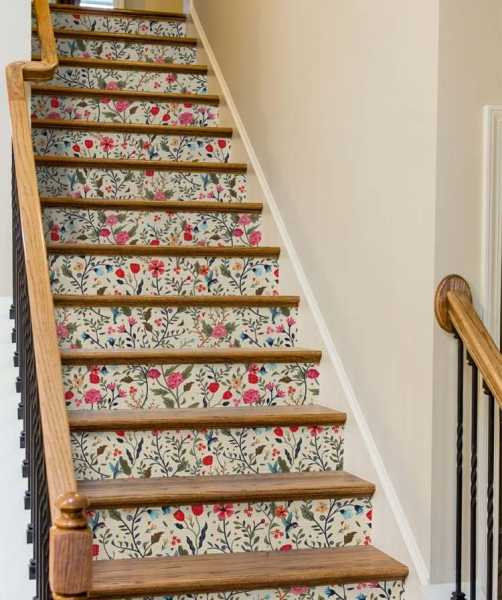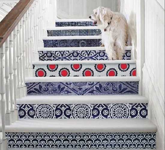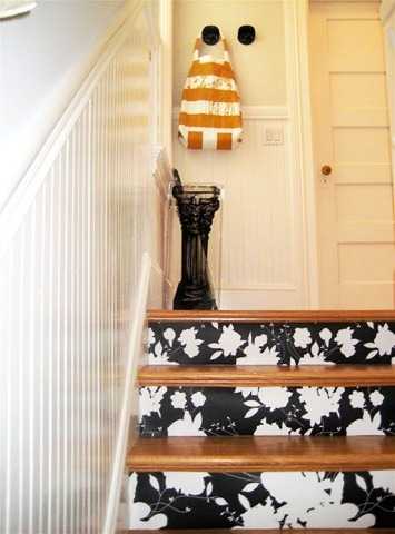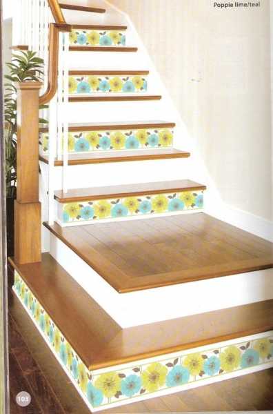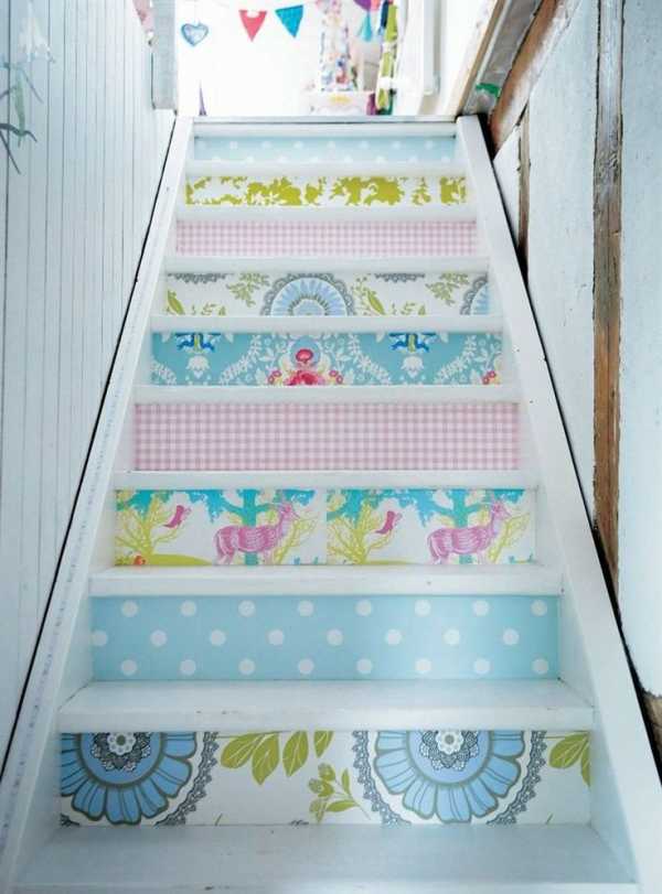 Интересно и броско обои смотрятся на фасадах лестничных ступенек.