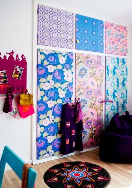 Оригинально будет смотреться шкаф, стенки которого обклеены обоями разного цвета.