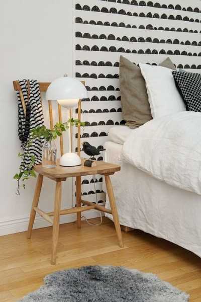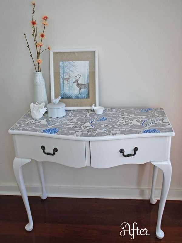 «Но у меня на стенах висят очень красивые картины, старых комодов нет, и изголовье кровати нравится в своем изначальном виде,» — скажете вы. Тогда вот еще одна идея: поверхность стола, тумбочки, табурета можно украсить остатками обоев. Получается очень мило.