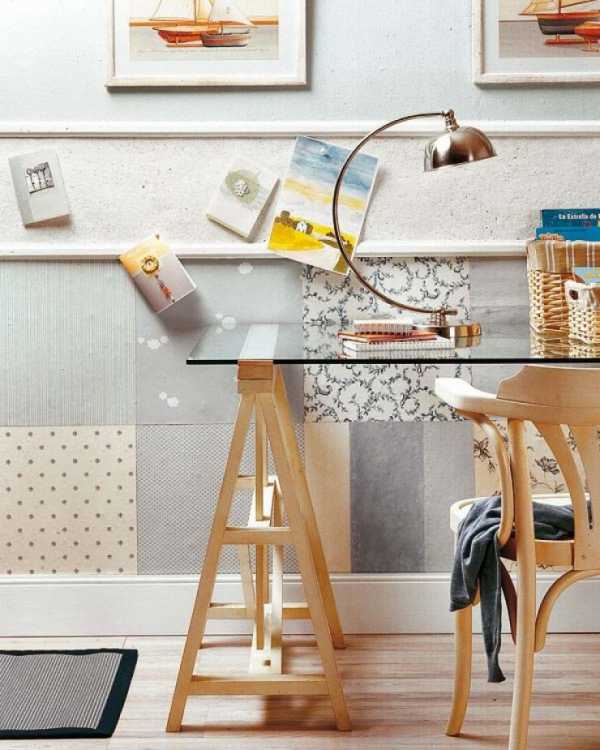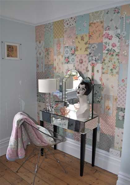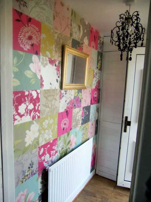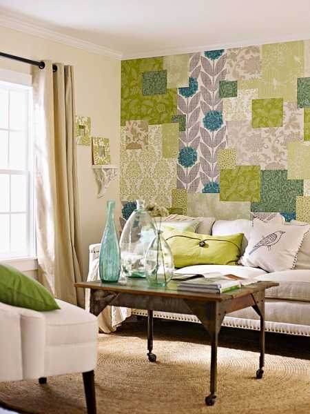 Предварительно обои нарезают квадратами и прямоугольниками разных размеров и наклеивают в хаотичном порядке по своему усмотрению.