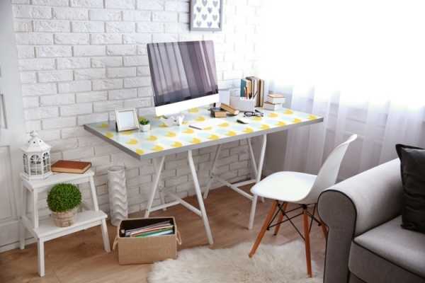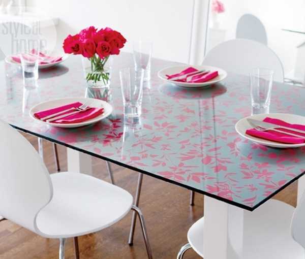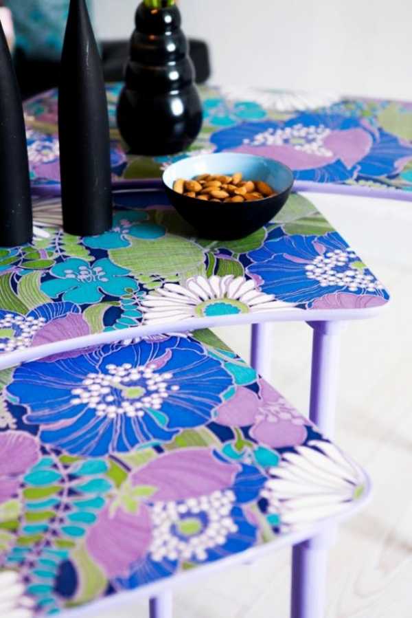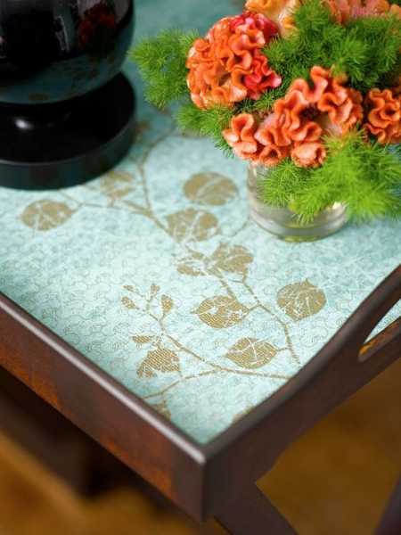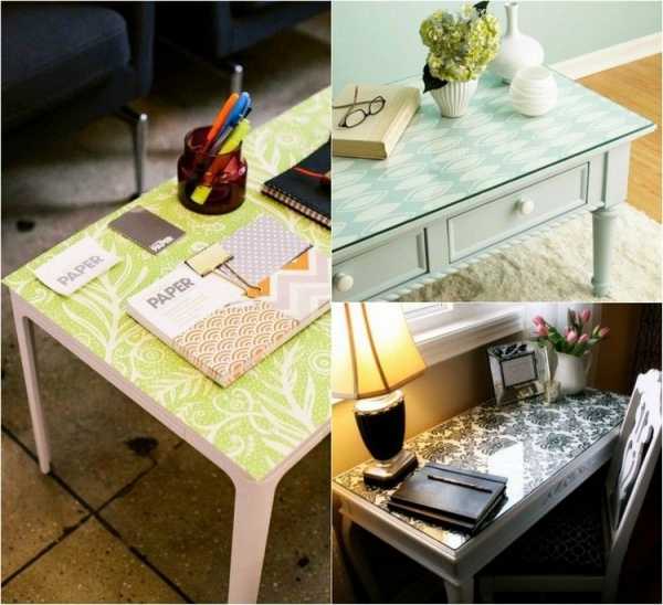 Превратить старый журнальный столик или рабочий стол в стильный предмет мебели также легко при помощи обоев. Для этого нужно вырезать кусок обоев по размеру столешницы и найти стекло такого же размера, и при помощи него закрепить на столе бумагу. При желании обои всегда можно поменять. Это позволит использовать любимый стол, потерявший хороший внешний вид, ещё долгое время.